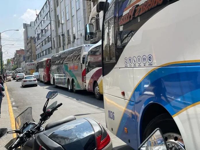 En calles como Artículo 123LópezVictoria y Morelos, cerca de las 13:00 h ya es posible observar gran cantidad de autobuses, algunos que, incluso, infringen el reglamento de tránsito pues no es está permitido estacionarse en la zona.